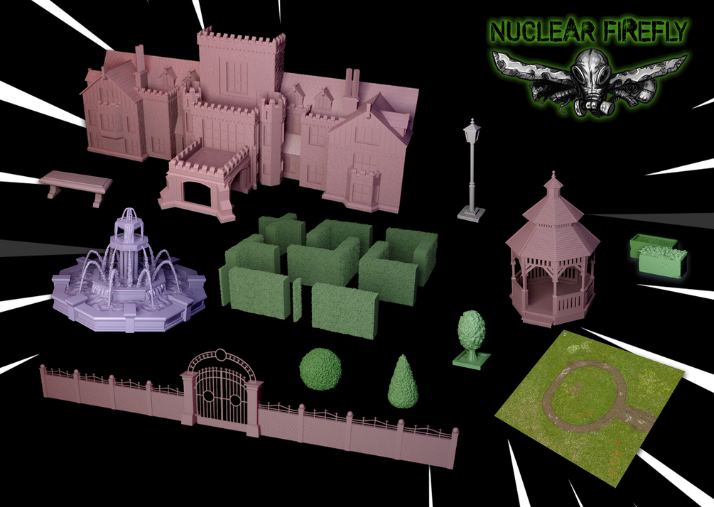With this files you will be able to get enough scenery elements to create a 36" x 36" gaming table centred on a mansion and its gardens, as well as a PDF to be able to print a perfect mat for this table.