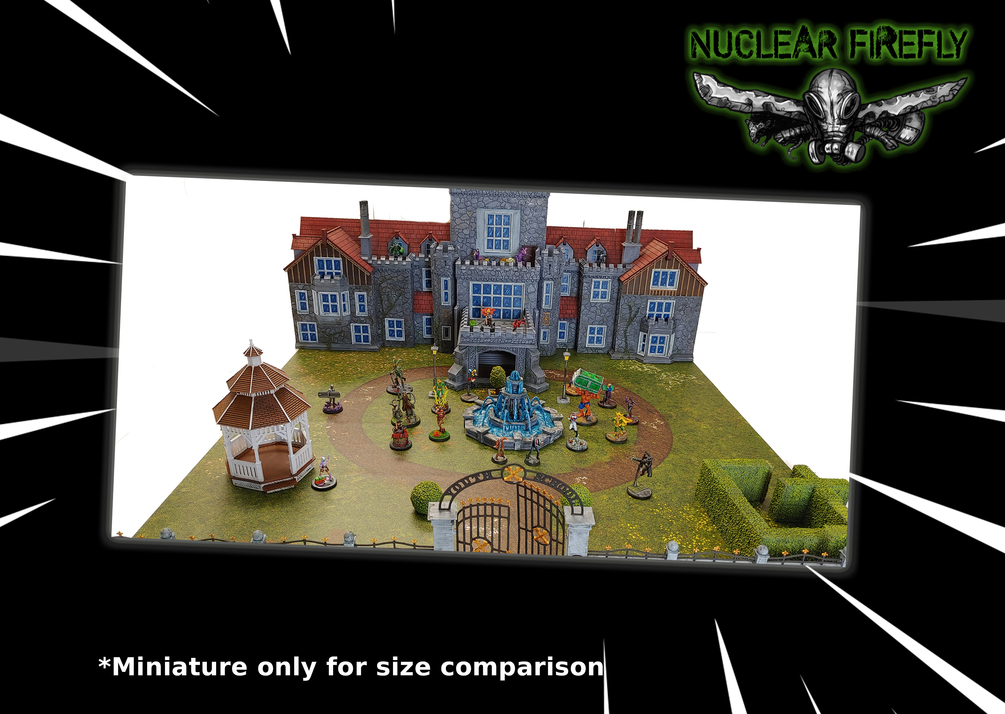 In order to keep the scale realistic and the table playable, what you actually have is the front of the mansion, as if it were a movie set, which will serve as the edge of the table. Therefore, it takes up the entire width of a 36" x 36" table. This building is full of details, but it is also designed so that you can place miniatures on its balconies and terraces.